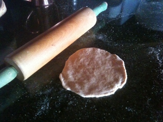 Today I decided to make homemade tortillas. As most endeavors in the kitchen, this process was more work than I thought. I used a whole wheat recipe that was little more than water (half a cup plus some added in later), whole wheat flour (two cups), baking powder (one teaspoon) and a couple of tablespoons of olive oil. I did not add salt as the recipe called for, but I did mix in about a teaspoon of herbs and garlic powder to give them a little flavor. The dough was a little tough, but once I got the hang of rolling it out...into what I would like to call a "circle", it got a little easier to manage.