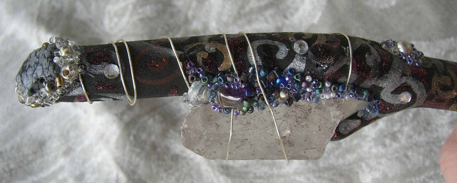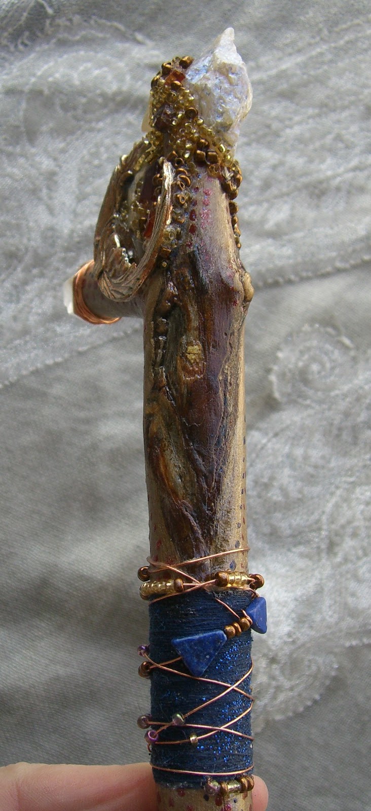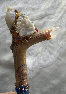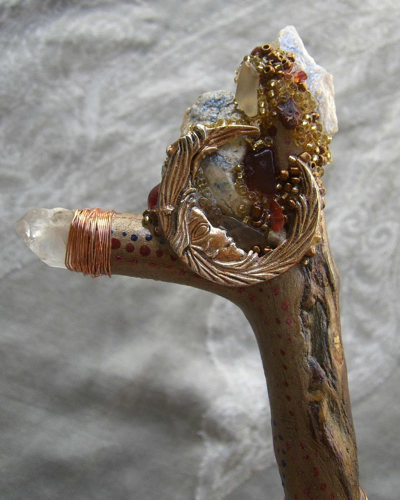 This Spirit Stick is a beautiful piece of pine adorned with North Georgia Quartz, a clear quartz crystal point, a citrine crystal point, a geode, charms, agate, jasper, lapis, suede, yarn, beads, baubles, and copper pieces/wire. The Bronzed Moonshine Wand measures approximately 16.5" long. This artful yet useful tool comes with instructions and will delight all who choose to seek its power.