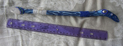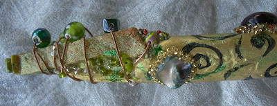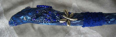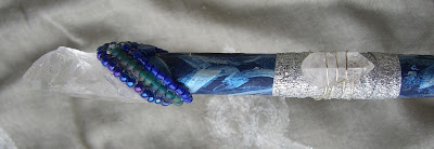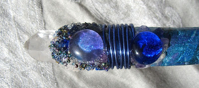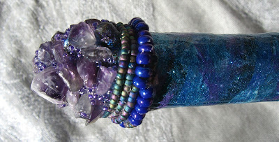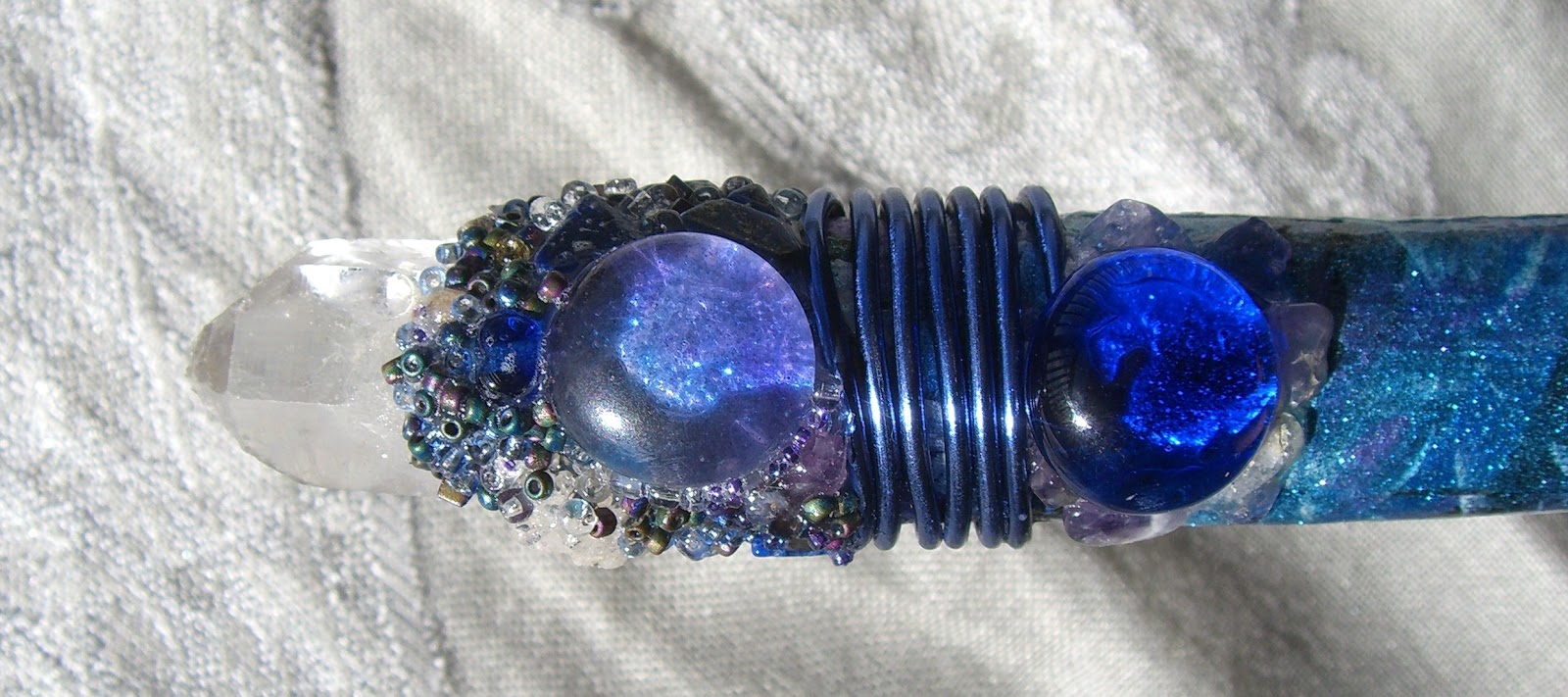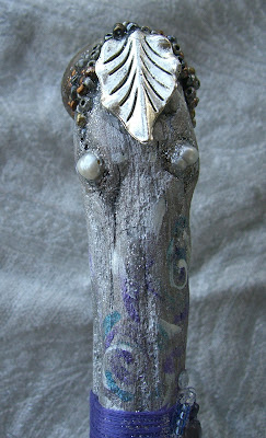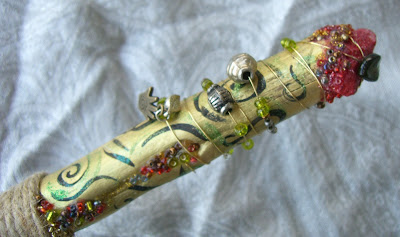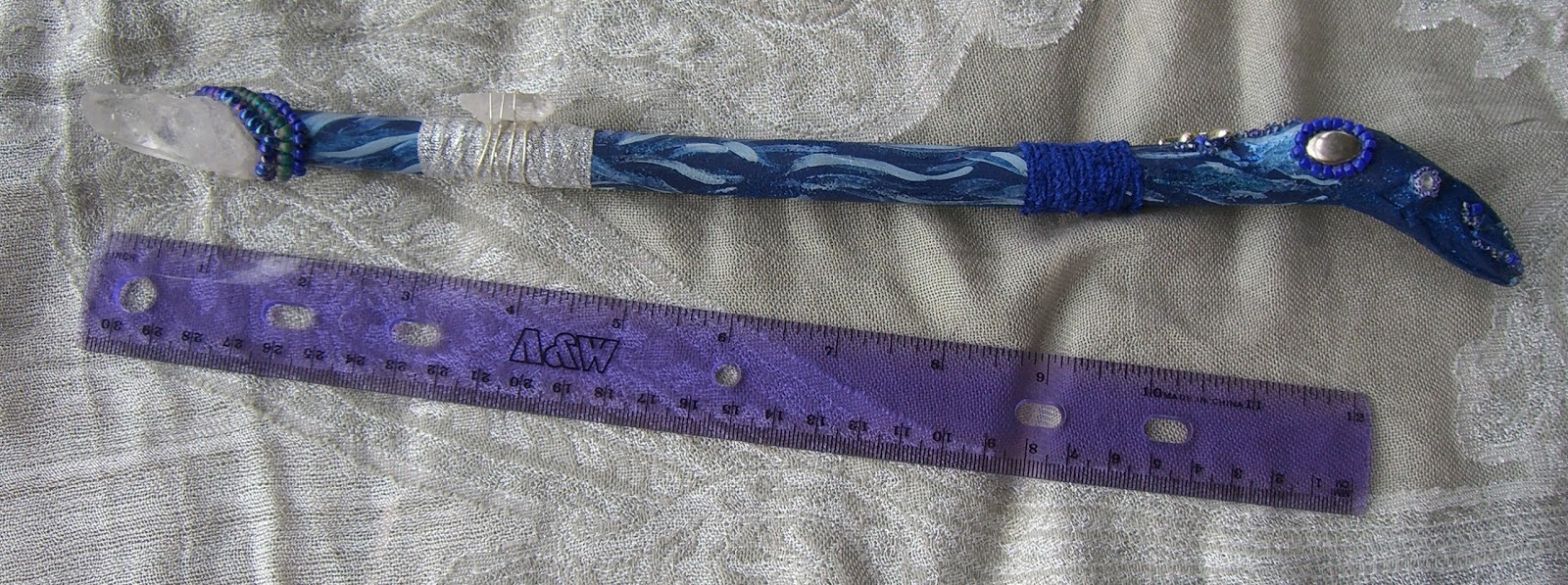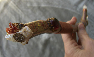 This Spirit Stick is a beautiful piece of pine adorned with North Georgia Quartz, a clear quartz crystal point, a citrine crystal point, a geode, charms, agate, jasper, lapis, suede, yarn, beads, baubles, and copper pieces/wire. The Bronzed Moonshine Wand measures approximately 16.5" long. This artful yet useful tool comes with instructions and will delight all who choose to seek its power.