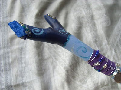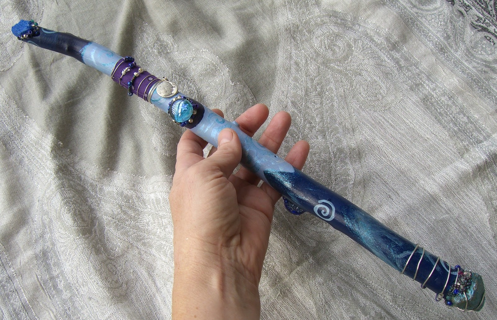 Mountain Majesty is made of oak and measures appoximately 18" long and varies in width from 1/2" to 7/8". She is adorned with beads, bobbles, quartz rocks, wire, amethyst and metal charms, and other found objects.