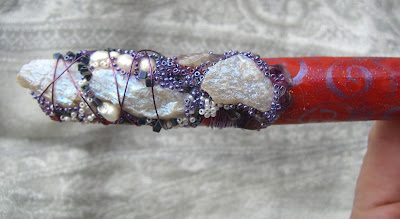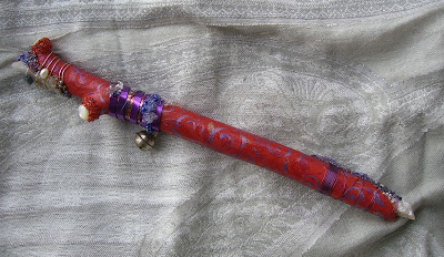 Red Hot Fun is exactly that. She is pine and full of Spirit. She measures approximately 12" and is adorned with quartz, mother-of-pearl, freshwater pearls, lapis, wire, as well as glass beads and baubles and bells.