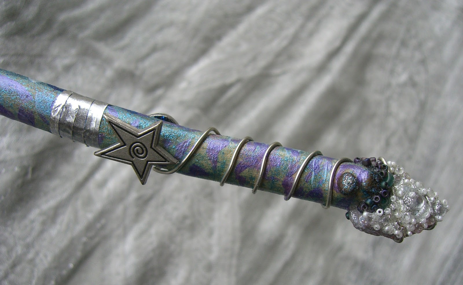 The Pixie Stick is a fun-filled 16 1/2" pine beauty ready to manifest magic. She is a sparkly blue, green, lavender, and pearl wand featuring quartz, assorted beads, buttons and bobbles, wire, ribbons, metal charms, and genuine freshwater pearls. She is pure magic and ready to bring enlightened fun into your life.