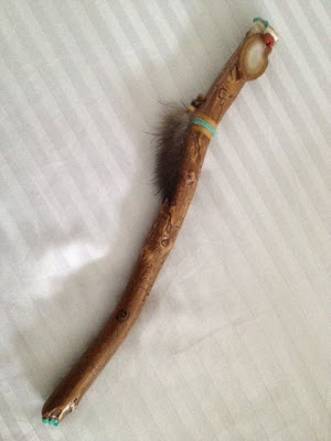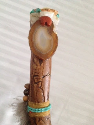 Feathered Fish Spirit Stick is made of pine and measures approximately 15.5" long. She is adorned with turquoise, 2 red jasper bear fetishes, mother of pearl, north Georgia quartz, beads, hemp thread, wooden beads, and an agate slice. She is imbued with magic and ready to help you manifest all of your wildest dreams! Instructions enclosed in package.