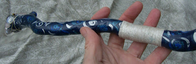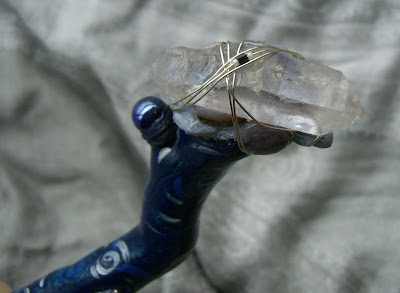 The Serpent Spirit Stick is made of pine and measures approximately 18" long. She is adorned with a clear quartz crystal point, amethyst, lapis, jasper, rose quartz, wire, rhinestones, beads, baubles, and hemp twine.