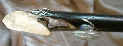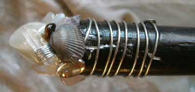 This special wand measures approximately 18.5" long. She is adorned with a large sharks tooth, two clear quartz crystal points, moonstone, hematite, labradorite, agate, jasper, tigers eye, stainless steel wire, suede cord, beads, pearls, and a sterling silver spider. She is imbued with magic and ready to help manifest the wildest of dreams!