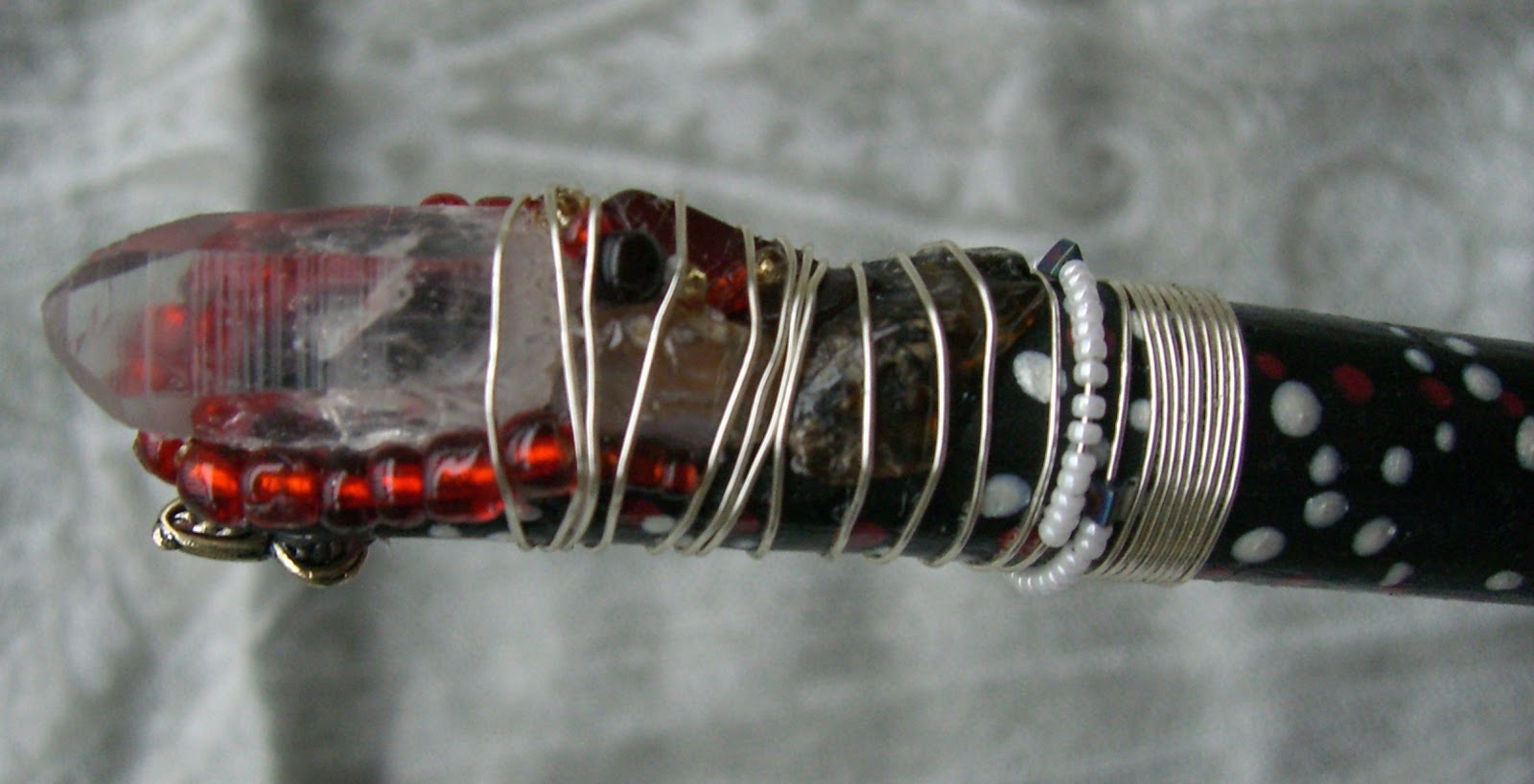 The Transformation Spirit Stick is made of pine and measures approximately 18" long. She is adorned with two silver butterflies, a clear quartz crystal point, a snowflake obsidian star, labrodorite, abalone shell, jasper, agate, beads, baubles, wire, hemp, glass, and magic of course!