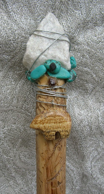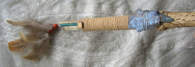 This special wand measures approximately 16" long, (not including the feathers). She is adorned with a clear quartz crystal point, a jasper bear fetish, bone, beads, glass baubles, suede, wire, a silver spiral/hand charm, shell, turquoise gemstones, native north Georgia quartz, a chipped arrowhead point, a sharks tooth, and feathers. This wand also is covered in naturally occuring markings by the creatures of Mother Earth. There has been no additional carving on this wand...just amazing carvings by insects. She is imbued with magic and ready to help manifest the wildest of dreams! Instructions enclosed in package.