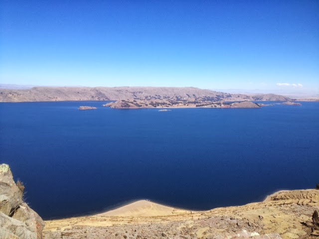 It took me about an hour to get up here and the early hour is totally worth it. I have the whole place to myself. From several viewpoints up here you cannot see any signs of mankind. On one side is the village and I see terraces for farming in several directions. But mostly I see miles and miles of the highest elevation lake in the world, uninhabited islands, and mountains. Mountains everywhere in the distance, 360 degrees. Some are in Peru, some belong to Bolivia. Some are roundish and smooth looking, many are jagged and pointy. Then, there are the Apus. The mountain spirits... The highest snow covered peaks are the Apus, and they are just as sacred and majestic as you would think them to be.
